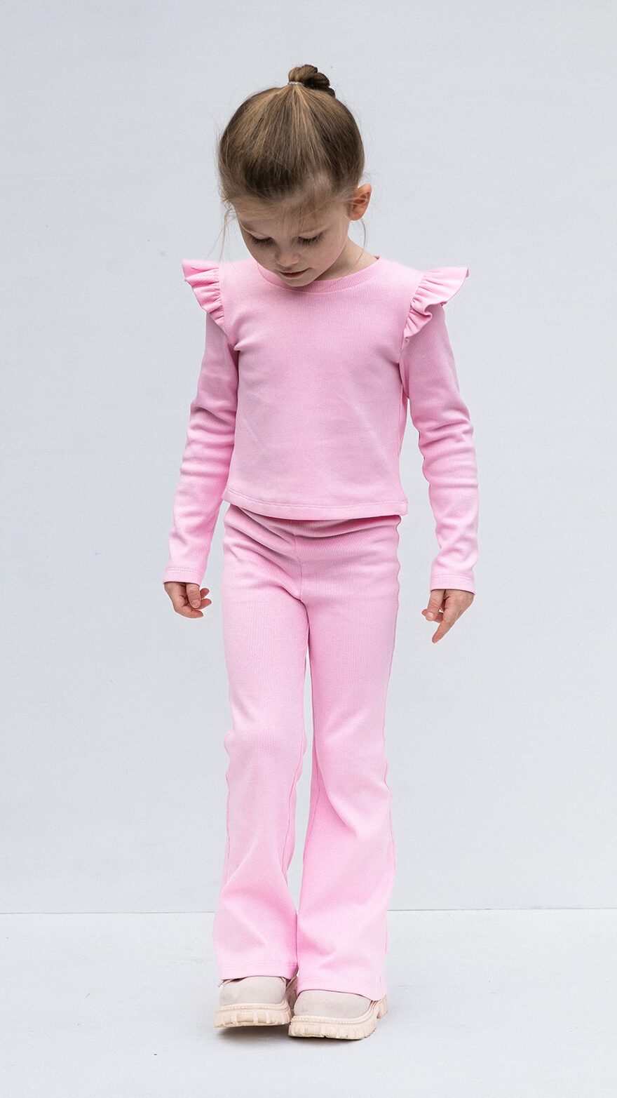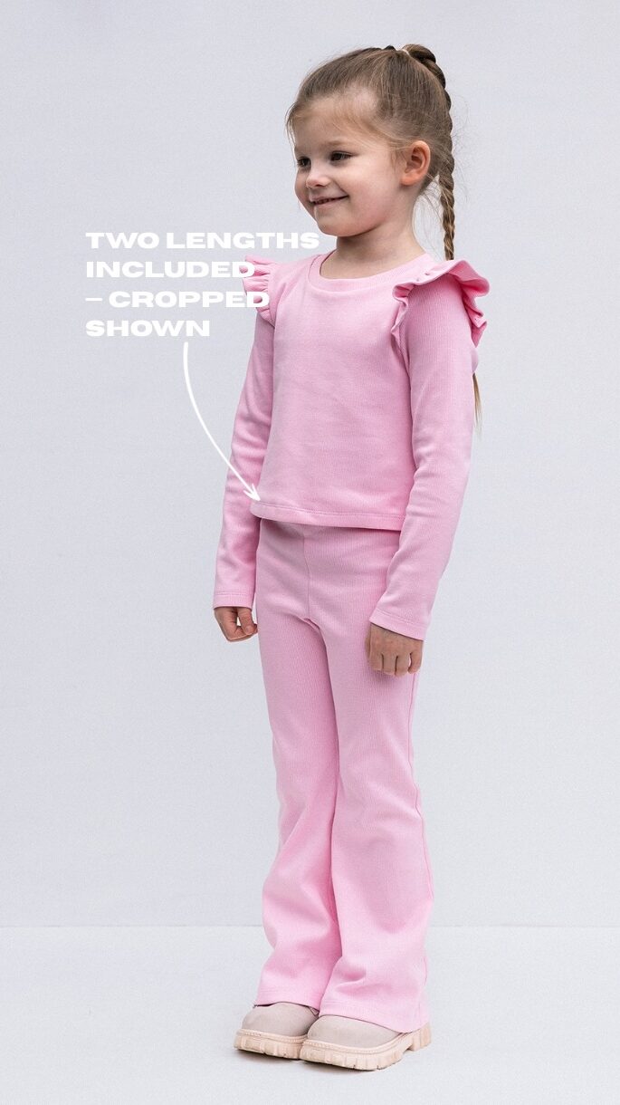 The Darling Set includes two top lengths — a regular length and a cropped length — paired with pull-on flare pants in a comfortable legging style. The top features soft shoulder ruffles that add movement and a playful, elevated look, while the pants are designed for a clean, modern silhouette with everyday comfort. Suitable for knit fabrics such as cotton jersey, rib knit, interlock, or French terry.