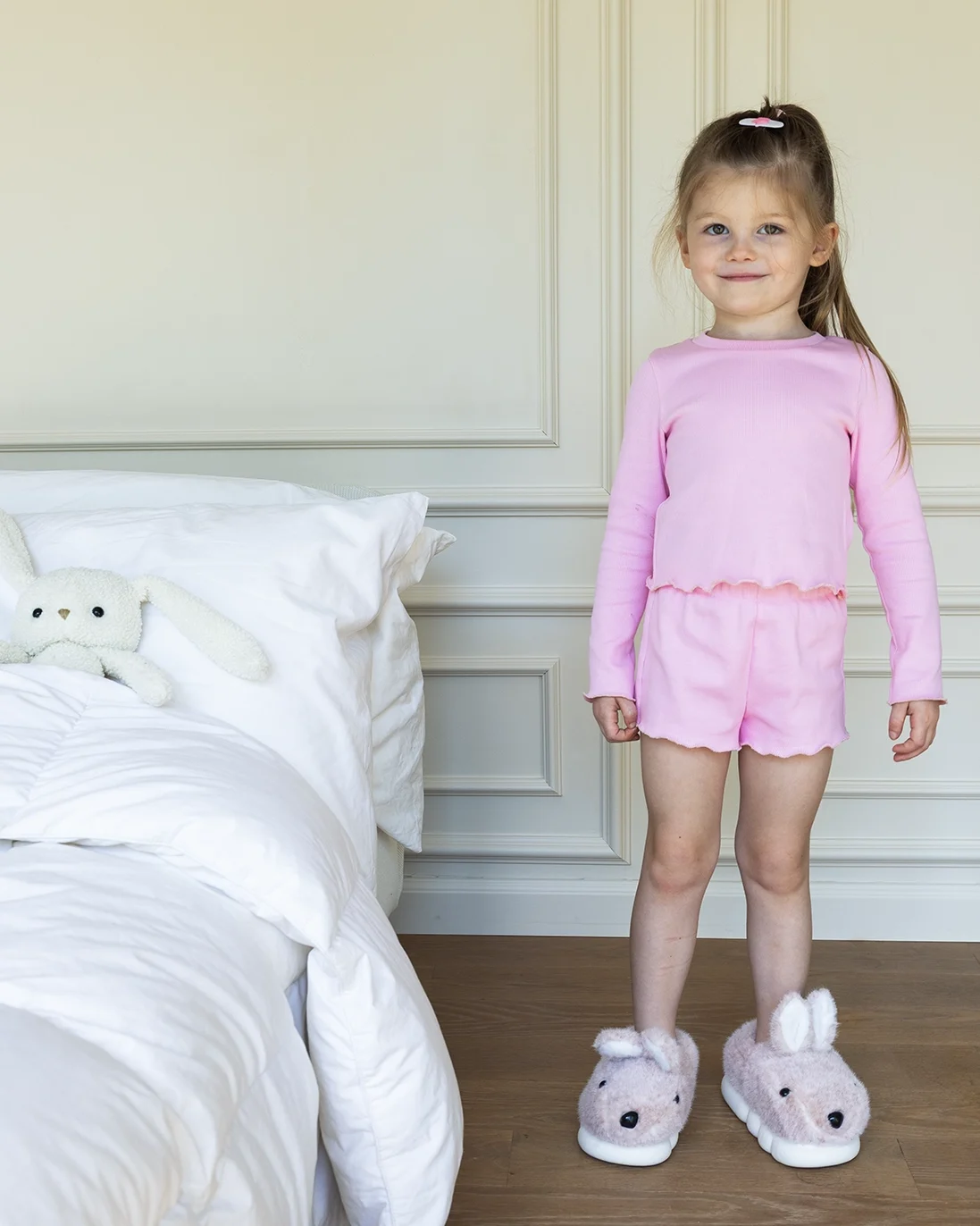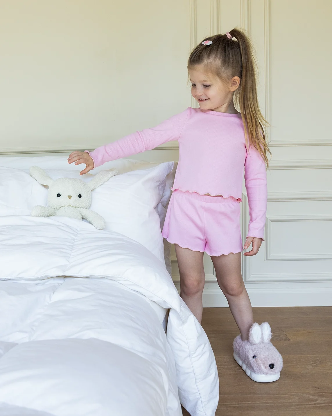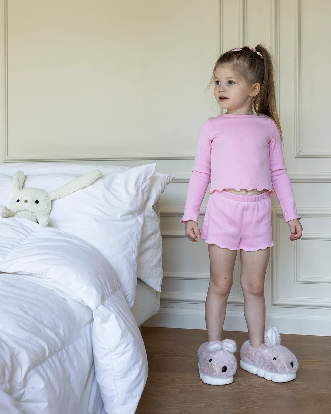 A playful lounge set for kids, featuring a relaxed top (short or long sleeve) and matching shorts, all finished with modern lettuce hems. Designed for knit fabrics. Sizes 12M–12Y included.