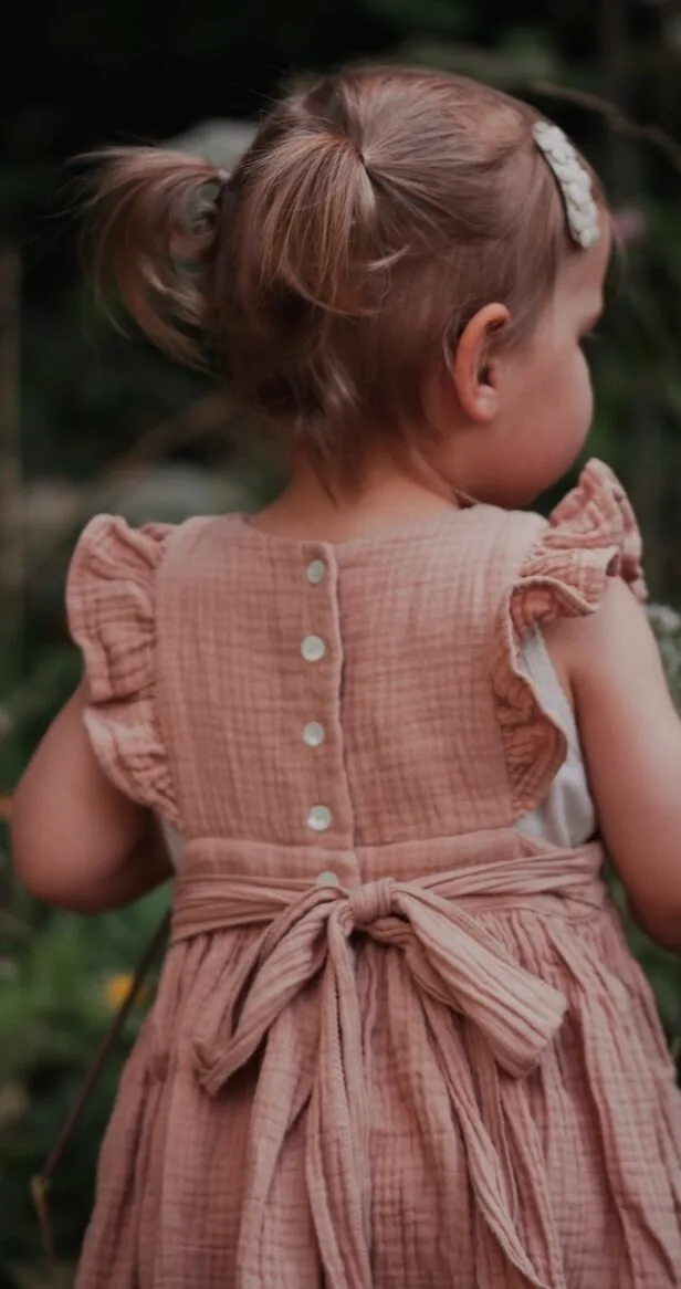 The Tiny Dancer Dress features ruffled straps, a back bow, and a classic pinafore style. Perfect for everyday wear or special occasions, it’s fun to sew and creates a timeless look.